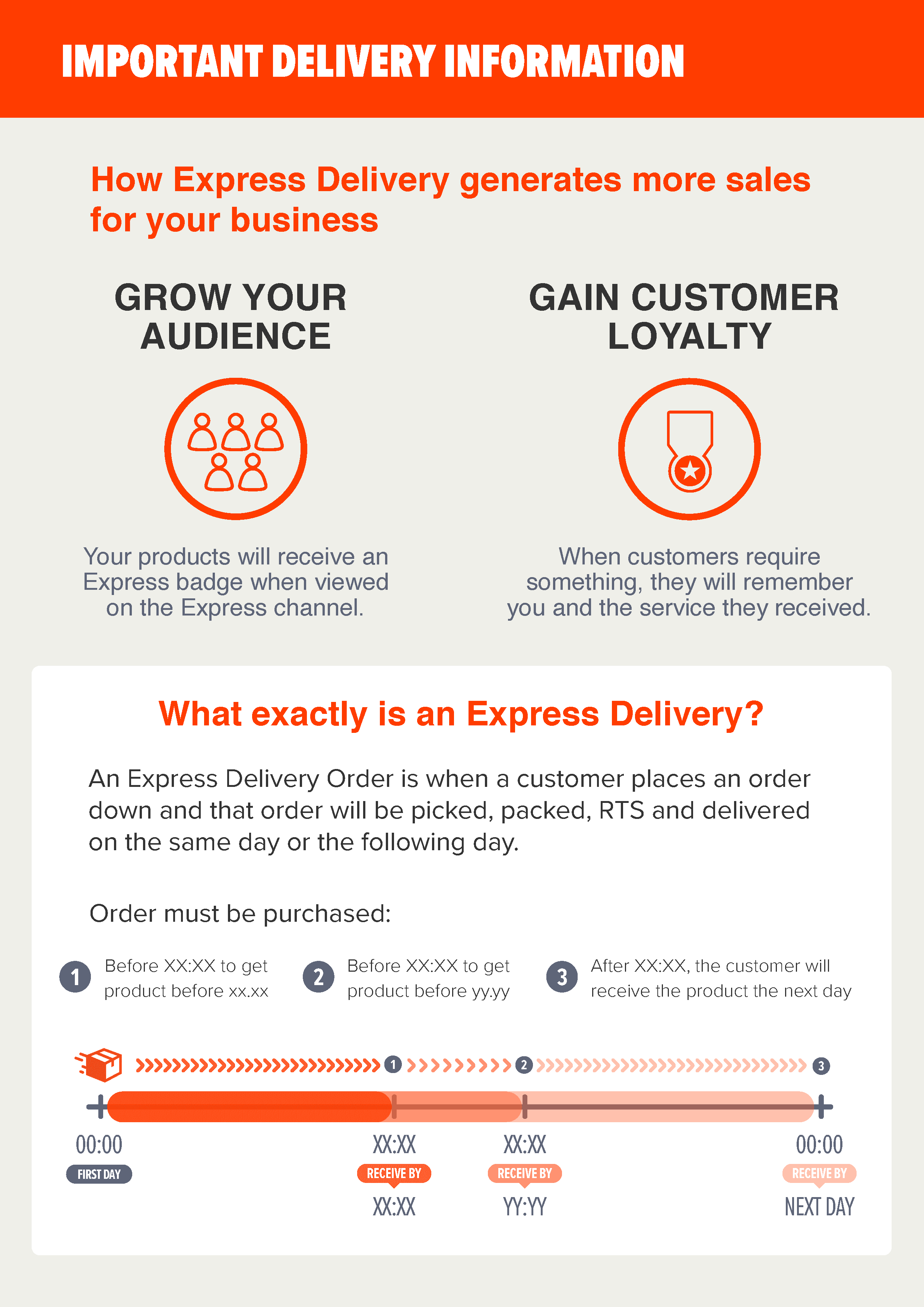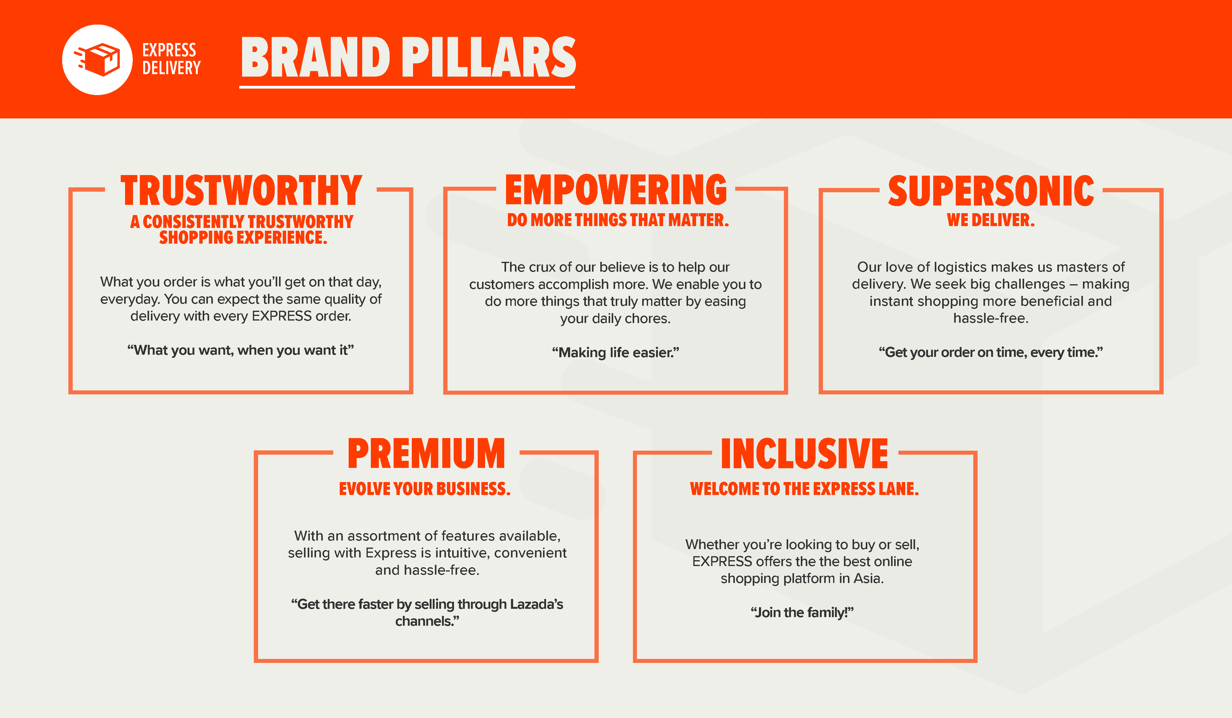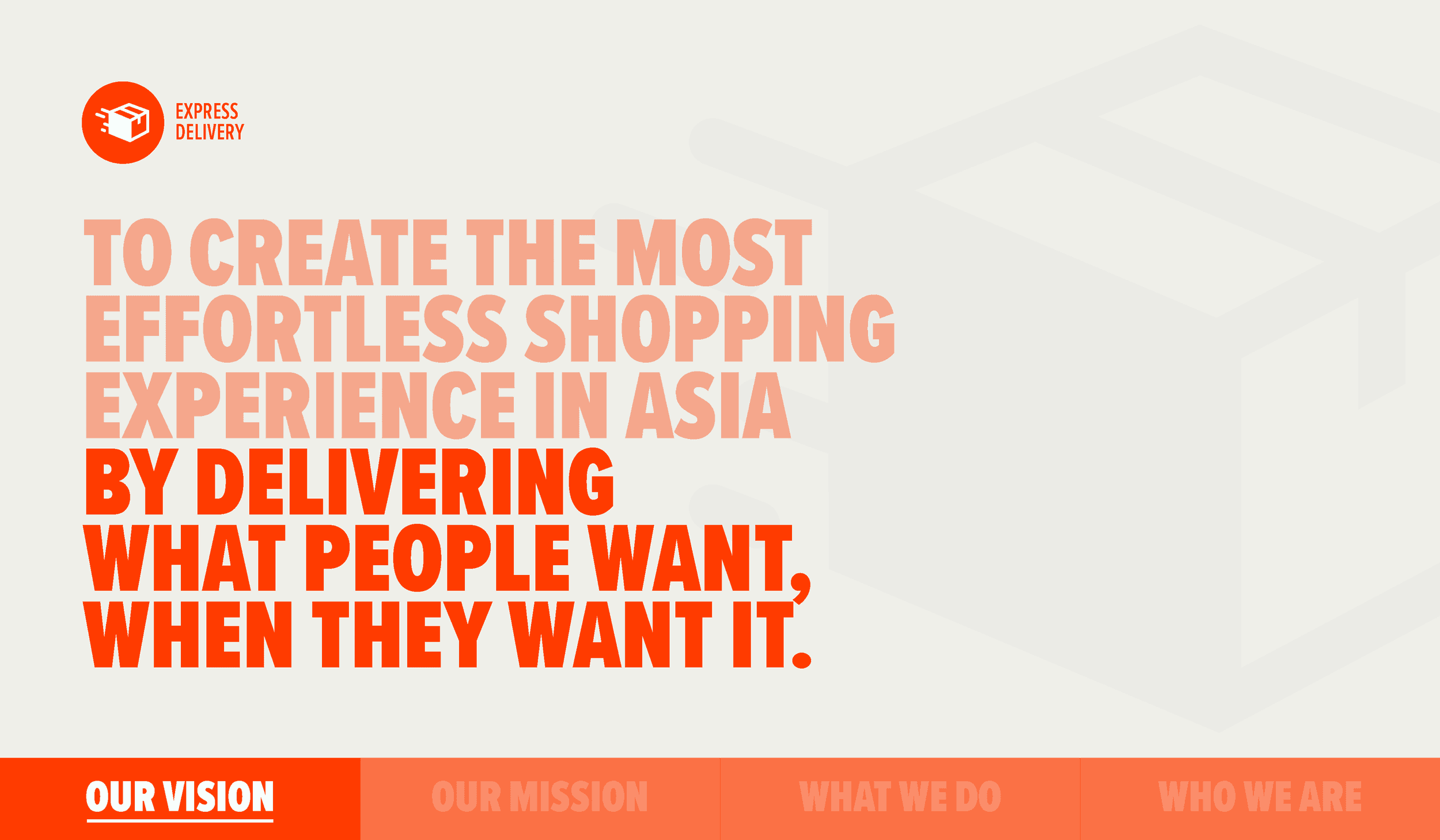 As a very new entity under the Lazada umbrella of companies, our EXPRESS DELIVERY service suffered from a lack of cohesion with regards to identity and visual alignment. Through discussions with stakeholders and the core Lazada branding team, we worked to establish brand pillars which would inform our messaging and use of visual elements. We recorded these decisions regarding the EXPRESS corporate identity in a branding guide, which was in turn used to maintain consistent messaging and visual alignment across any assets generated for the platform. Page samples: