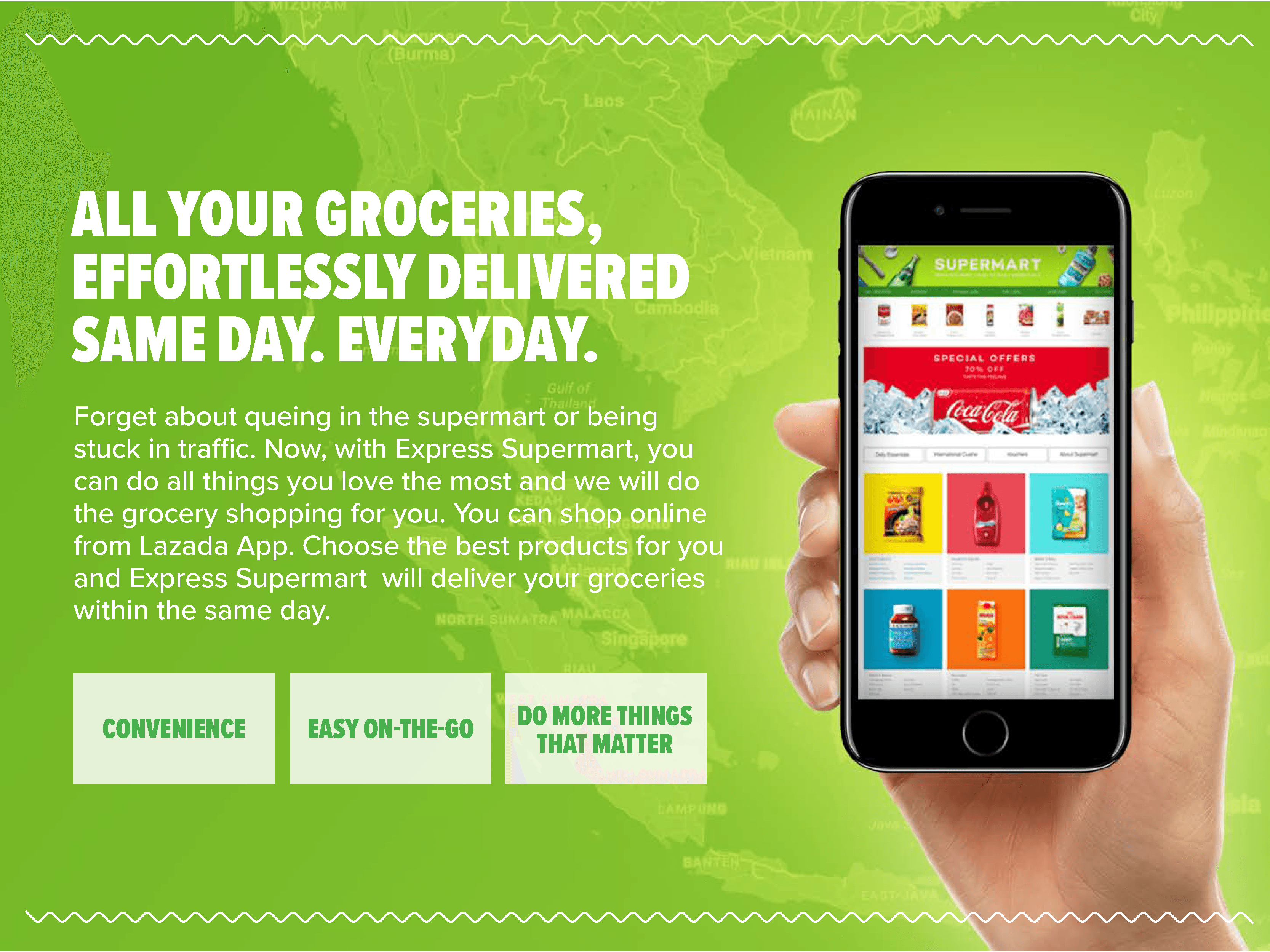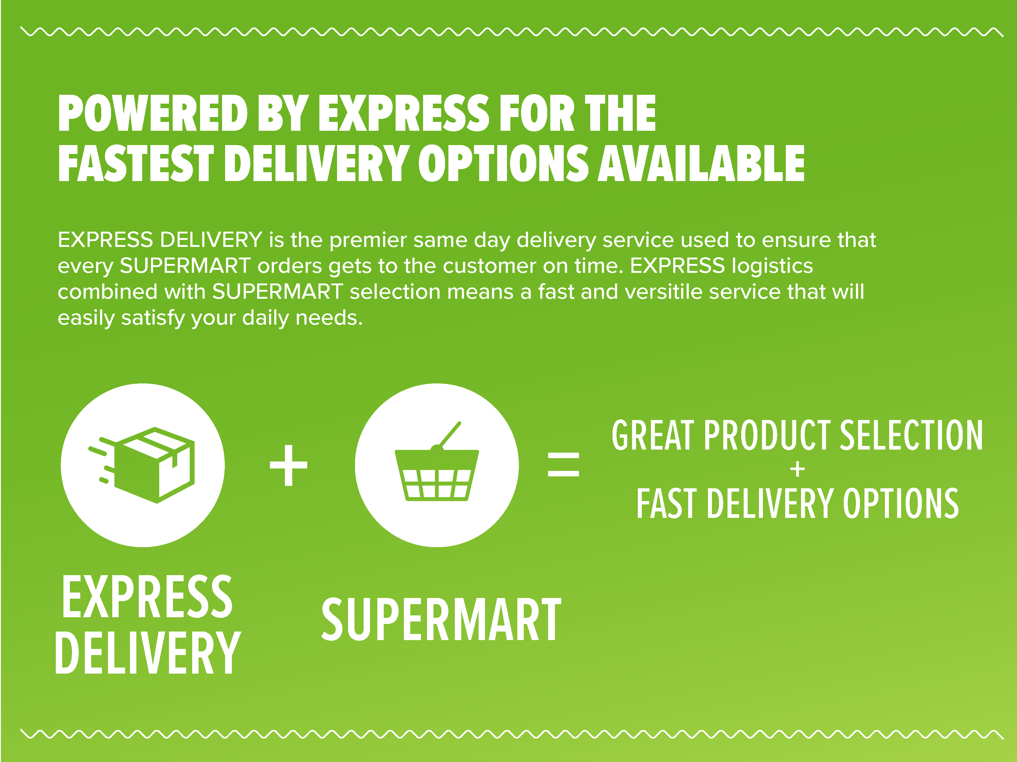 While working for the Lazada Group in Singapore, I assisted with the graphic design and brand positioning of their EXPRESS and SUPERMART sub-services. As part of their general expansion plan throughout South East Asia, Lazada had explored the idea of same-day delivery service to compete with companies like Amazon Prime Now. The EXPRESS service would focus on the same day delivery of general goods, while SUPERMART was more focused on food and household items.