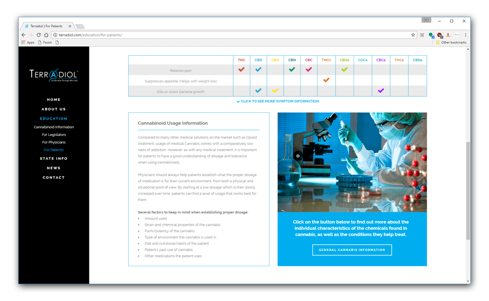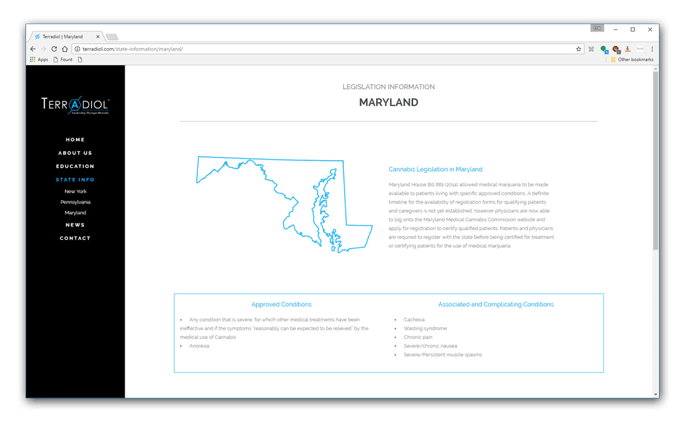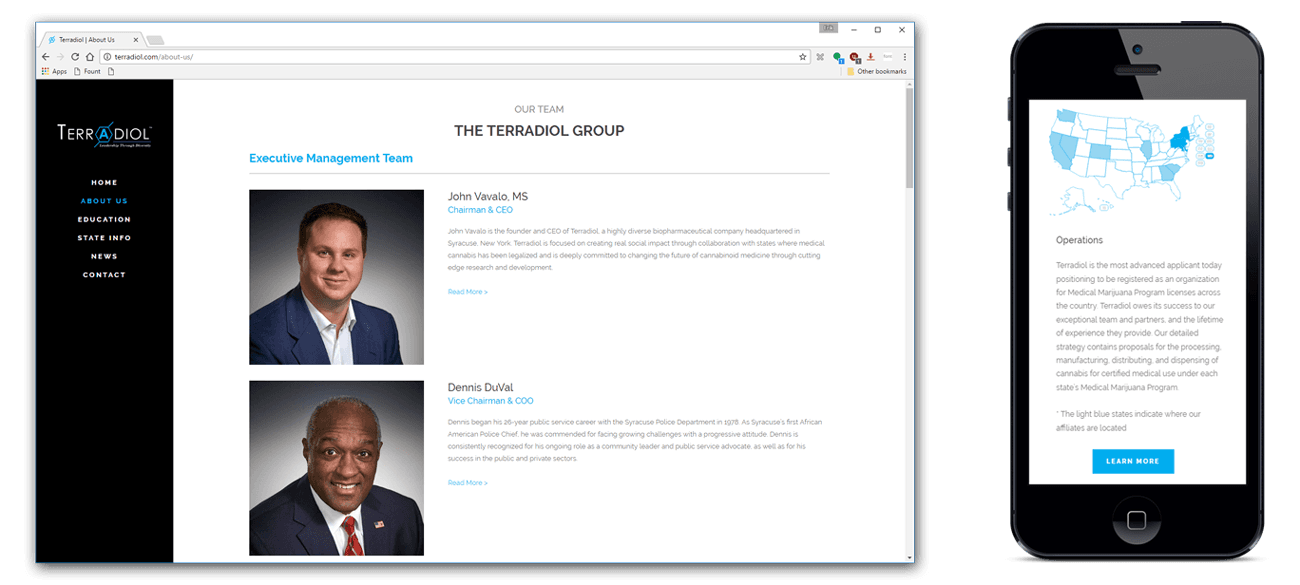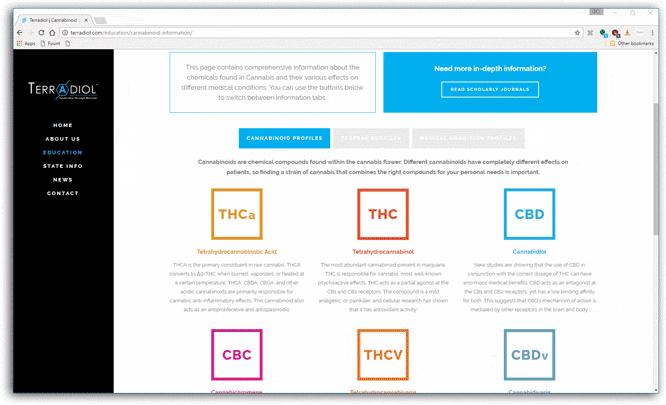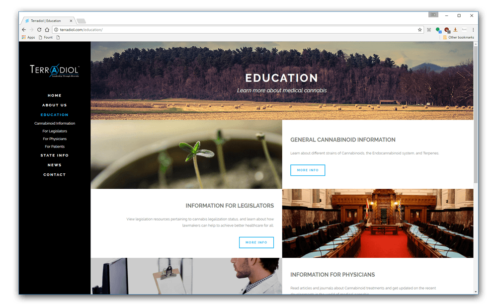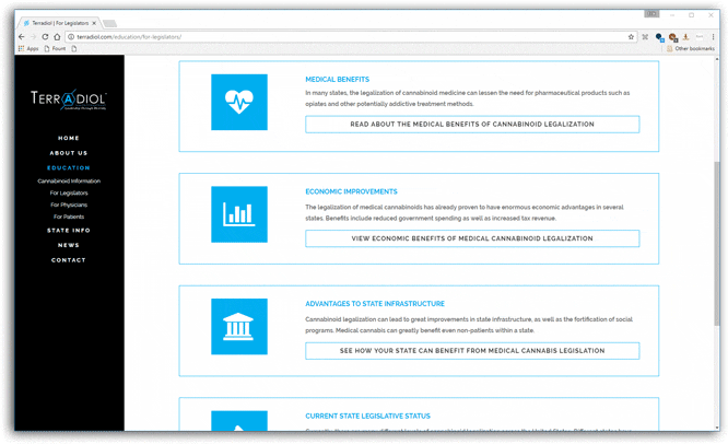 Terradiol is a bio-pharmaceutical company currently promoting Cannabinoid healthcare across the US. I worked with company CEO John Vavalo to establish a website design that matched Terradiol’s aesthetic while also communicating important information to our main user groups: doctors, patients, and lawmakers. The site contains educational information about Cannabinoid medicine and its legality across different states.