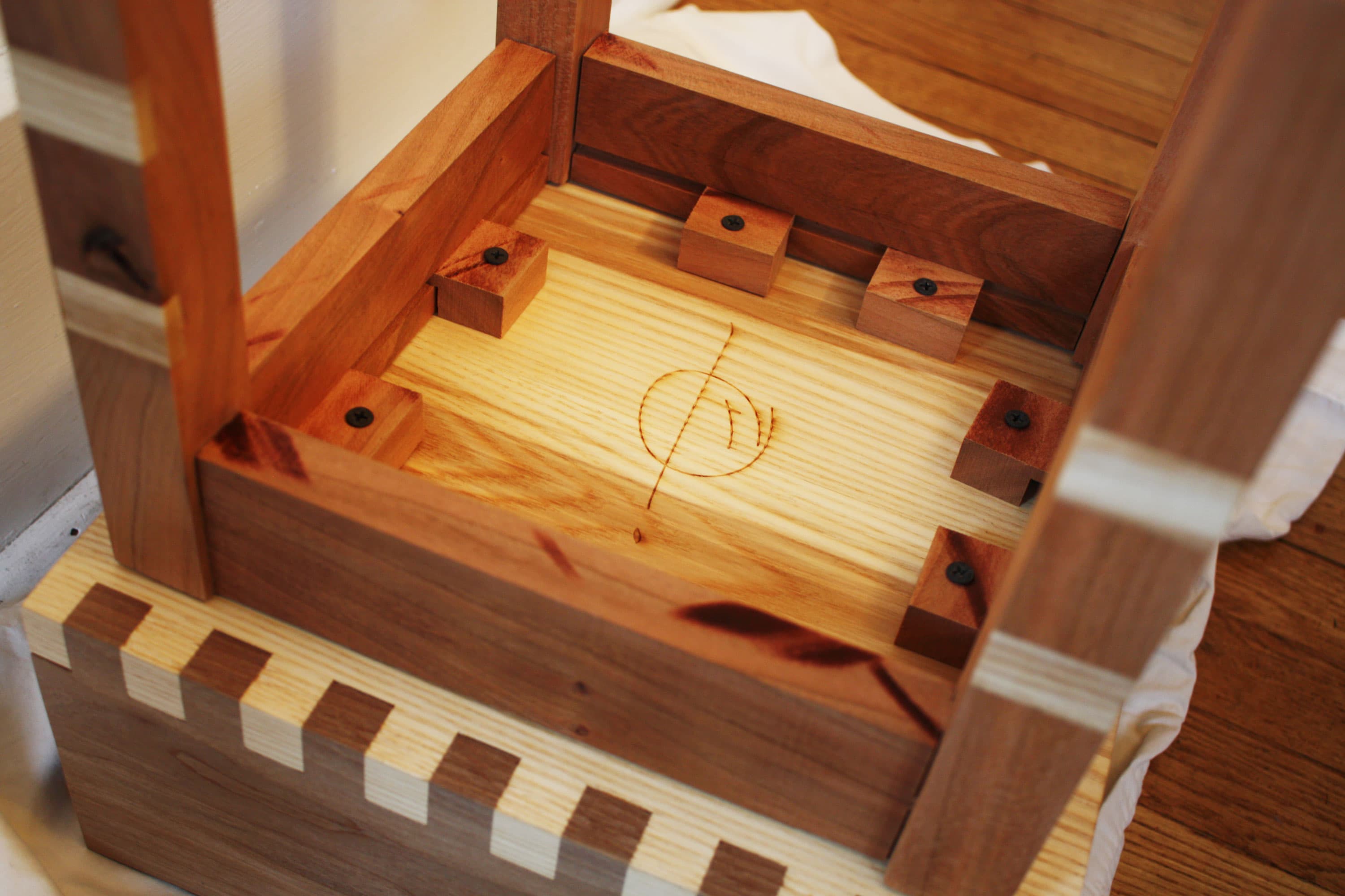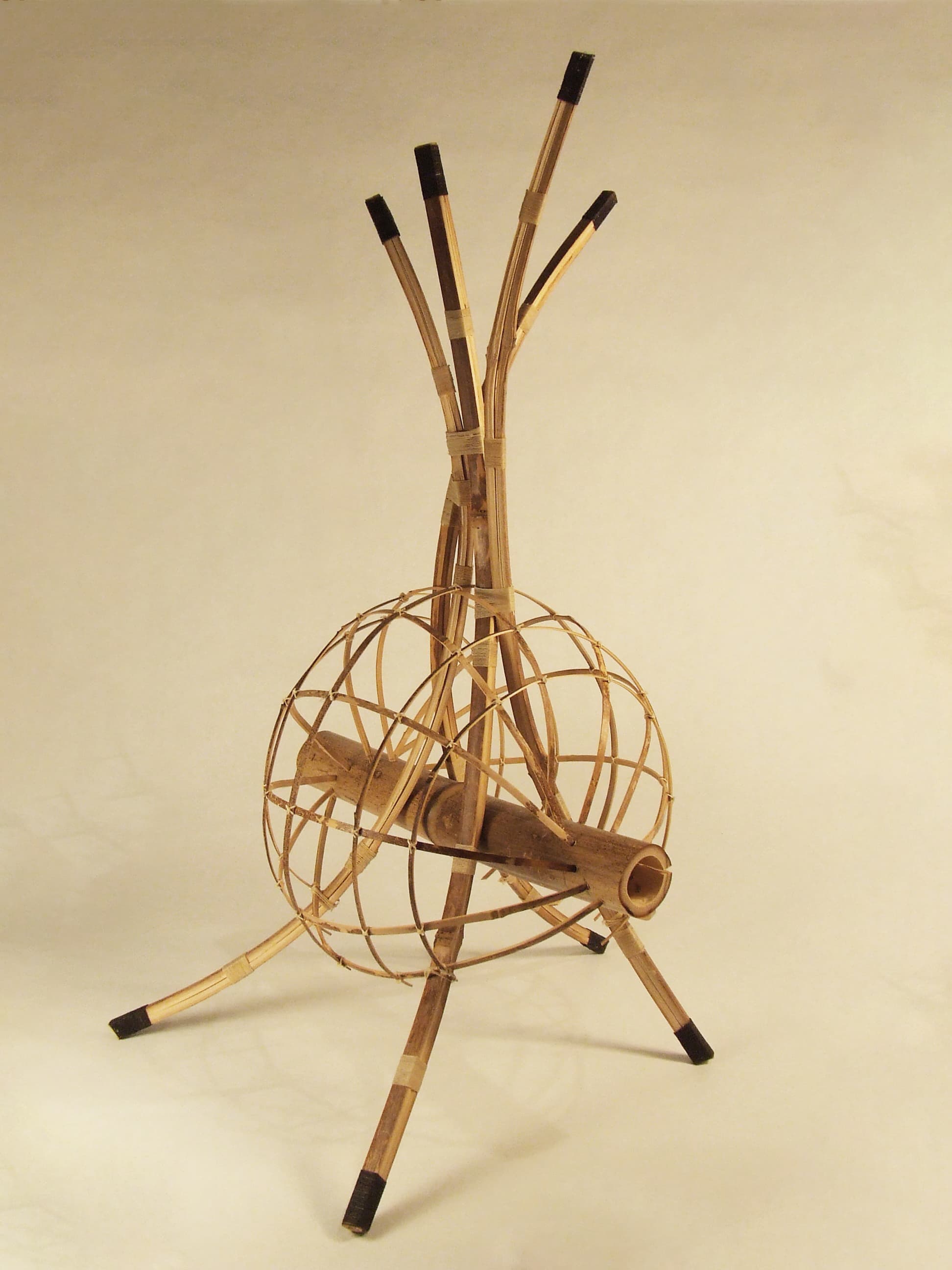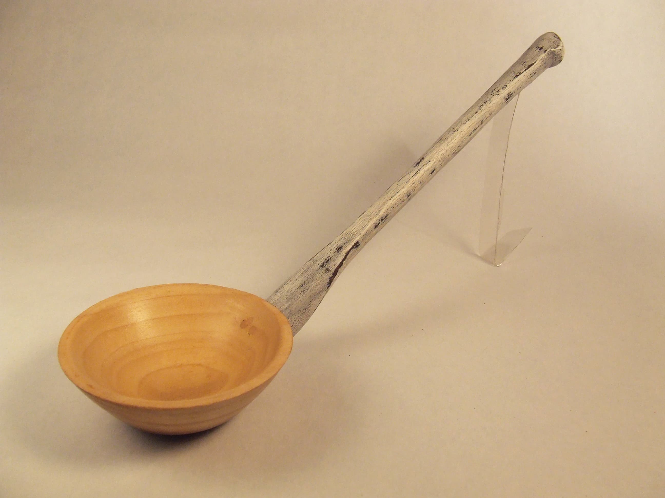 This two-part ladle structure includes an handle that was turned off-axis and treated with milk paint.